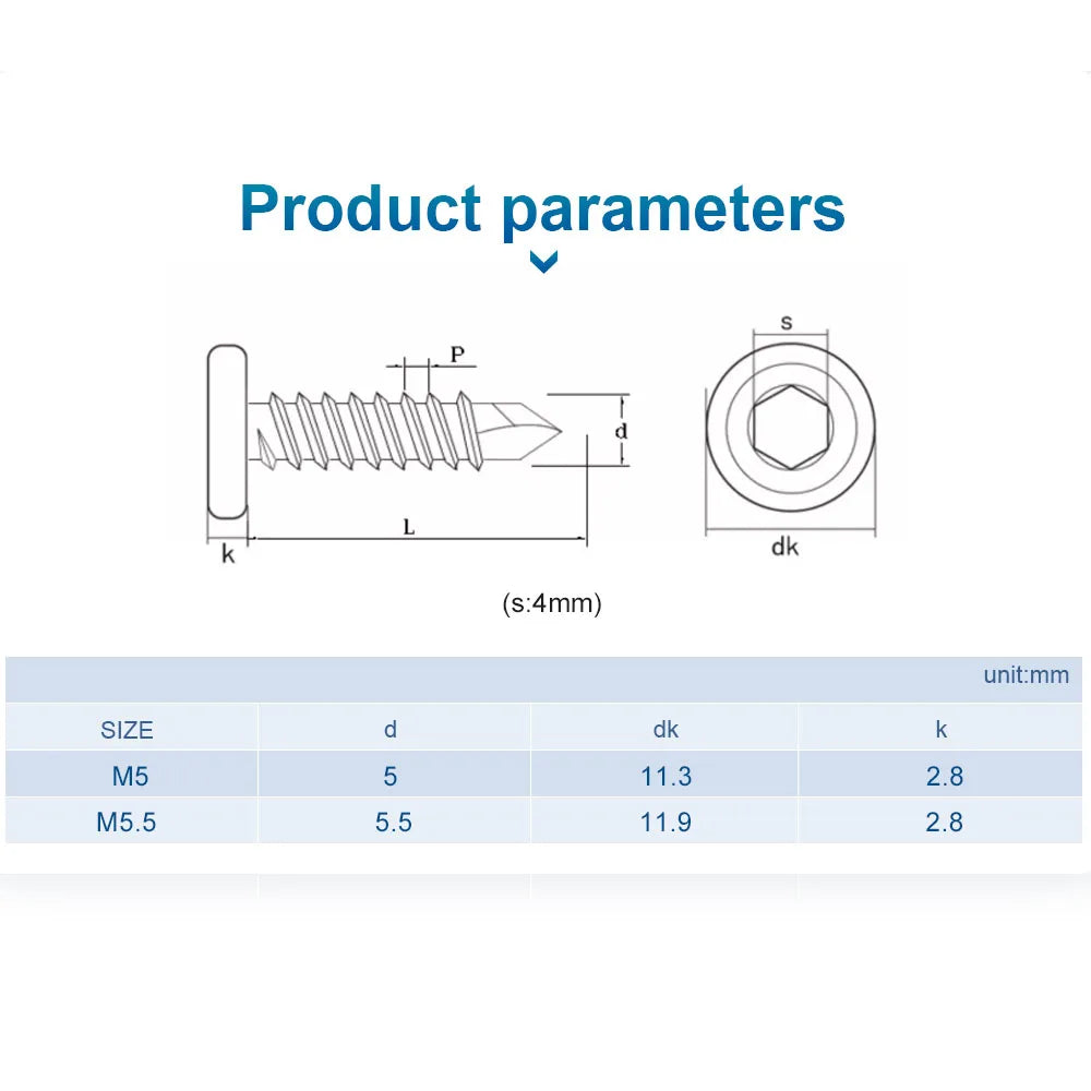 NINDEJIN 20pcs Flat Head Hex Socket Cap Self Drilling Screw Black Zinc 410 M5 M5.5 #12 Self Tapping Sheet Metal Screws