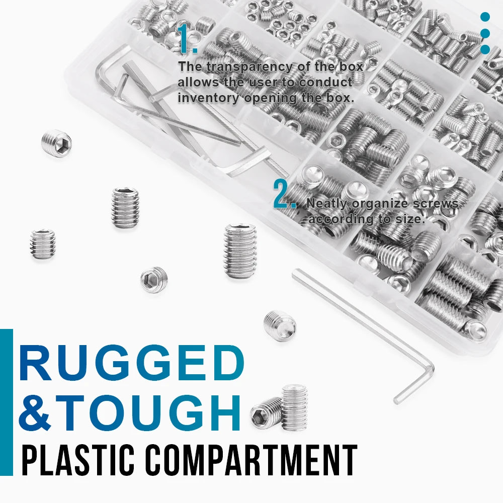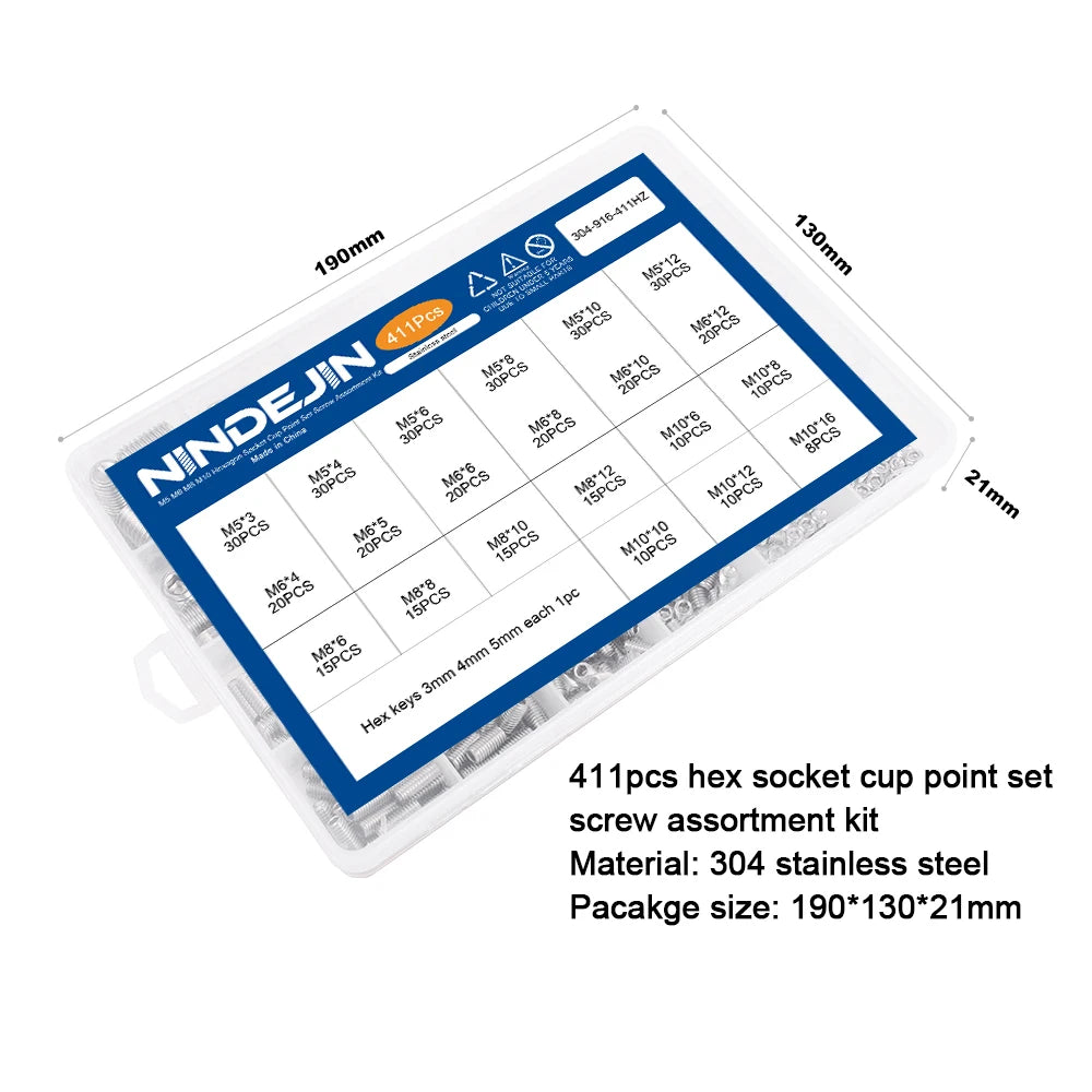 NINDEJIN 411pcs 1084pcs Hex Socket Grub Screw Kit M2-M10 Stainless Steel Cup Point Headless Set Screw Assortment Kit