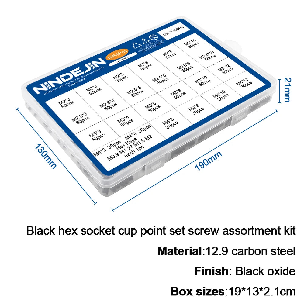 NINDEJIN Hex Socket Cup Point Set Screw M2 M2.5 M3 M4 M5 M6 M8 12.9 Carbon Steel Headless Allen Head Grub Screw Assortment Kit