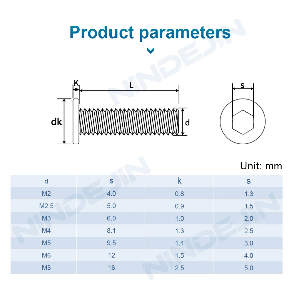 NINDEJIN Hex Socket Ultra Thin Flat Head Machine Screws Black 304 Stainless Steel M2 M2.5 M3 M4 M5 M6 M8 Allen Head Bolts