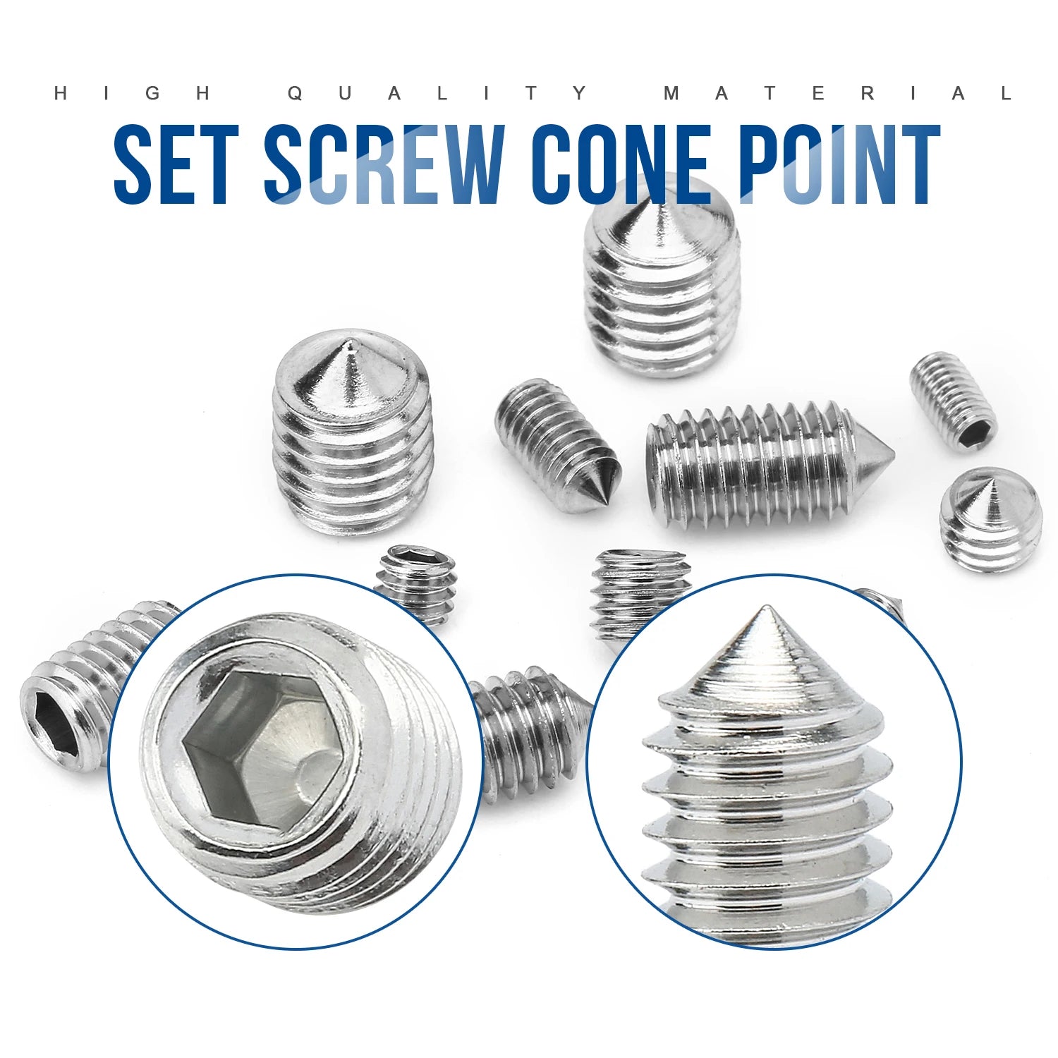 NINDEJIN Hexagon Socket Set Screw Kit Cone Point Stainless Steel Headless Grub Screw Assorment Kit M2 M2.5 M3 M4 M5 M6 M8