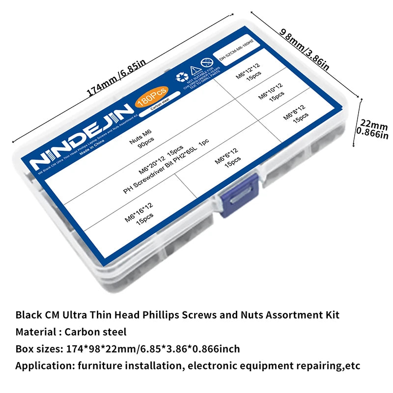 NINDEJIN M2-M6 Thin Flat Head Laptop Screw Set Black Carbon Steel Ultra Thin Wafer Head Phillips Machine Screw Nut Assortment